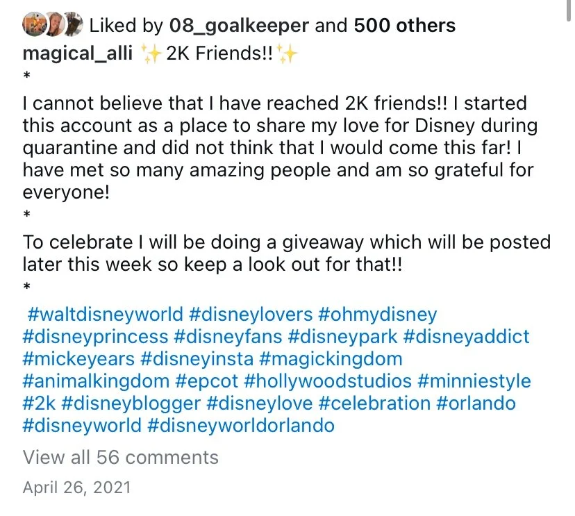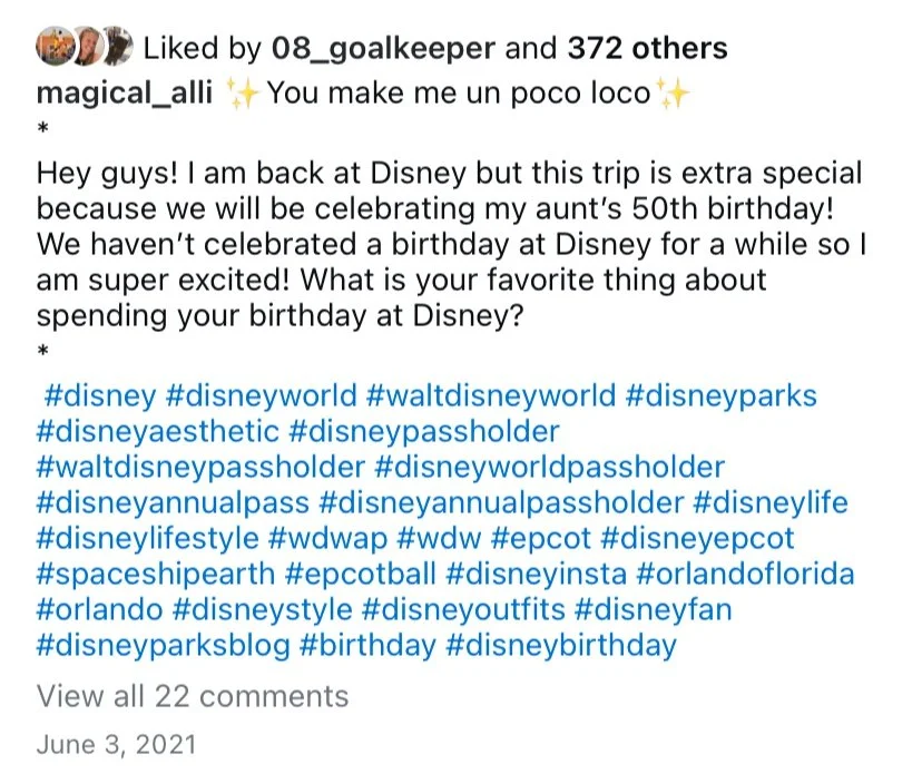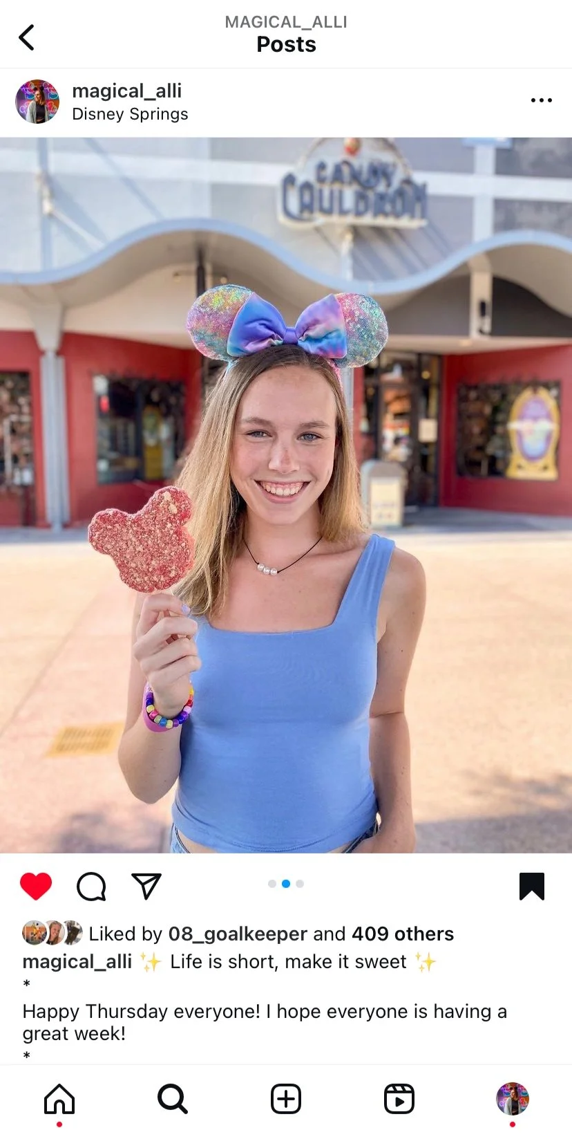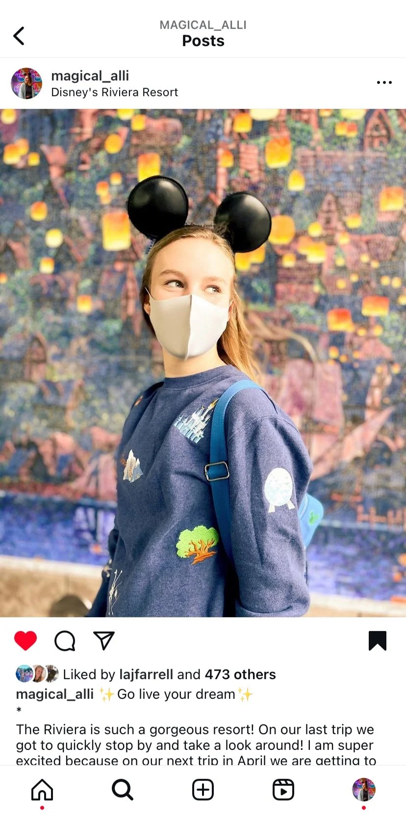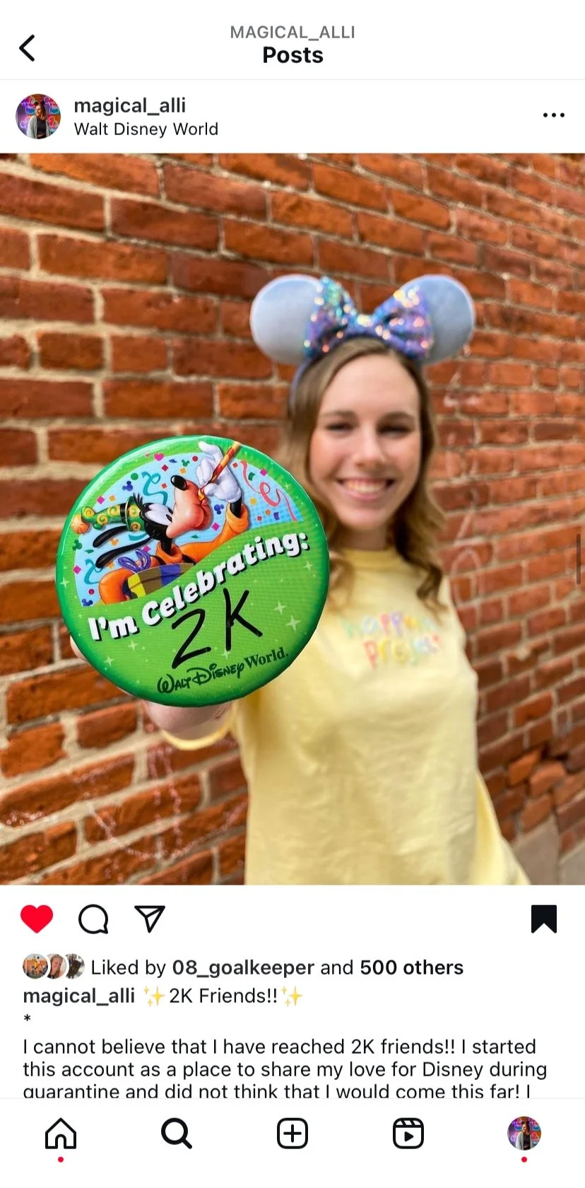During the COVID-19 lockdown, I created the Disney Instagram account @magical_alli as a fun little project to pass the time. I posted about my love for Disney and the Disney Parks and Resorts. During my time with the account, I gained 2k followers, averaged 400 likes per post, and had around an 18% engagement rate.